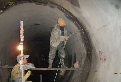 然后在不漏水部位按照材料使用要求,大面积涂抹聚合物水泥防水砂浆,需分层抹压,顺序为防水素浆--防水砂浆--防水素浆,后拨管堵水。